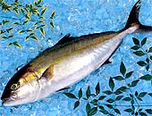 ブリの仲間では最も大きくなり、体長は1.5mに達し、頭部に背面から見て八の字形の暗色斑があることから、カンパチ(間八、勘八)と名付けられており、夏に産卵期を迎え、旬となり、刺身食材として人気のある美味しい魚です。
